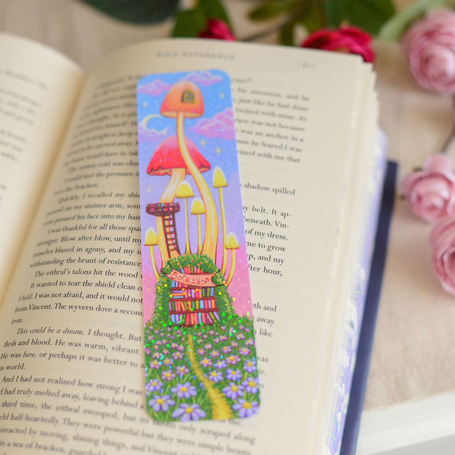This double‑sided bookmark features an original acrylic marker design, printed on thick, glossy paper. The front is laminated with a transparent holographic film that shimmers beautifully, especially under artificial light.