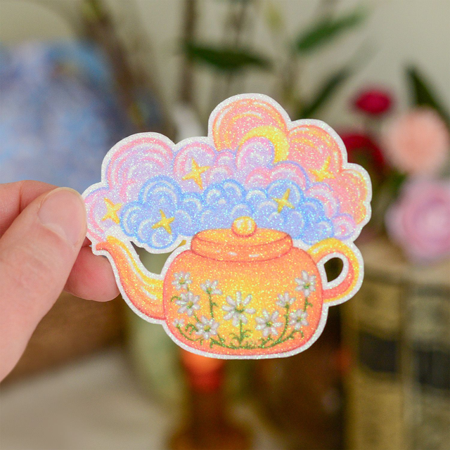 A sparkling glitter vinyl sticker featuring an original acrylic design. Bold and vibrant, this large sticker is the perfect way to add a touch of magic to your laptop, journal, or anything you’d like to personalize.