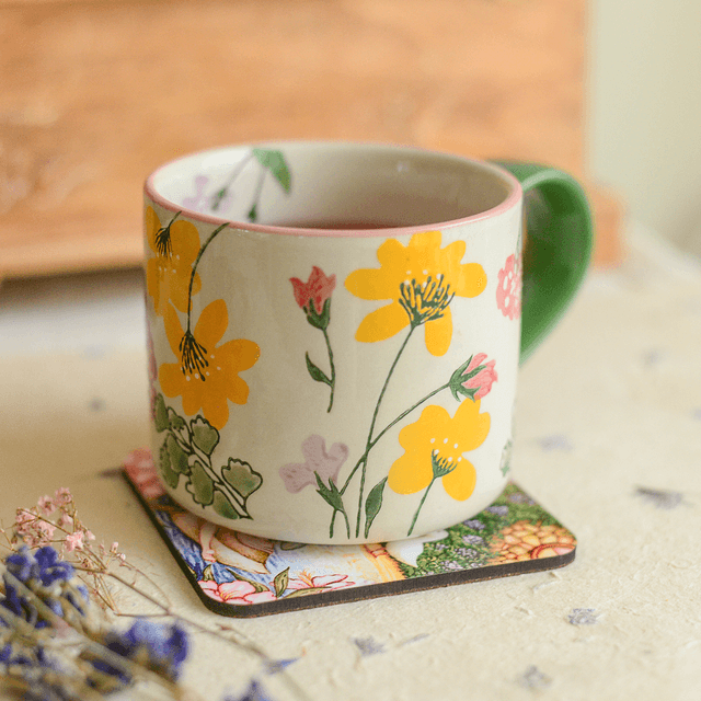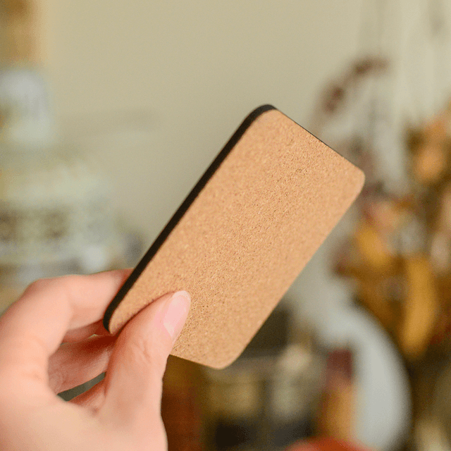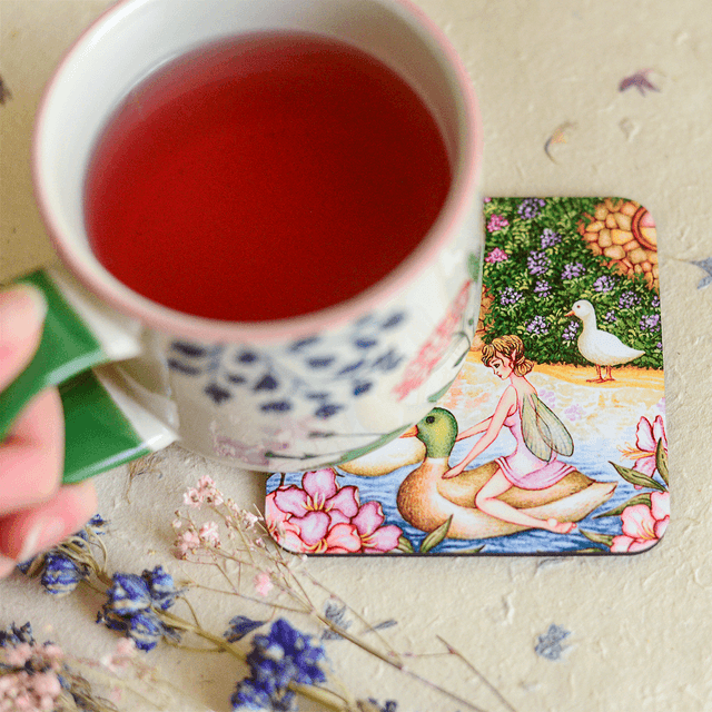 A cork-backed square shaped coaster features a vibrant glossy illustration on the front side.