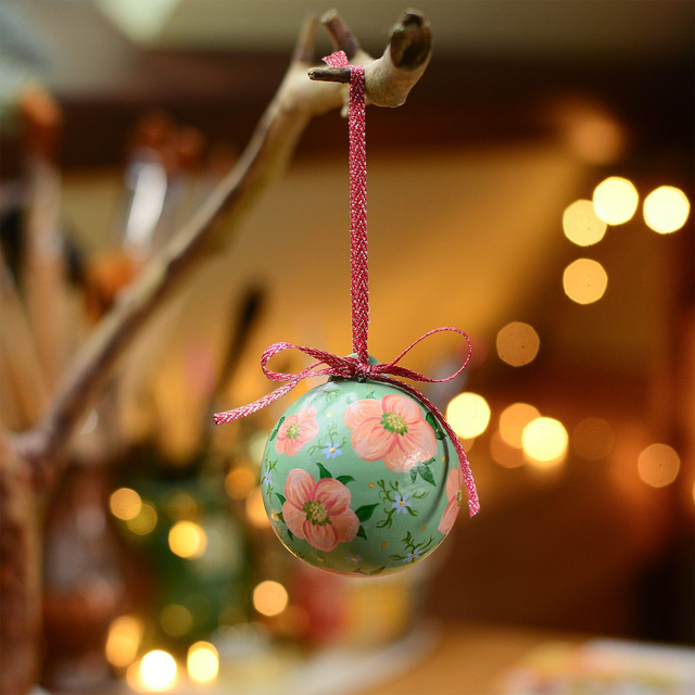 Ceramic ornaments hand-painted with delicate floral designs using acrylic paints. Each piece is finished with a glossy coating and decorated with a ribbon, making it a charming addition to any Christmas tree.